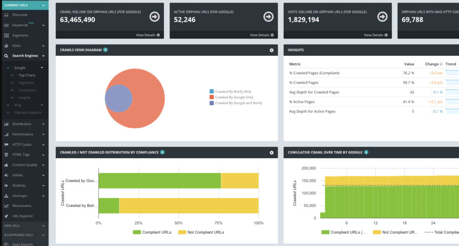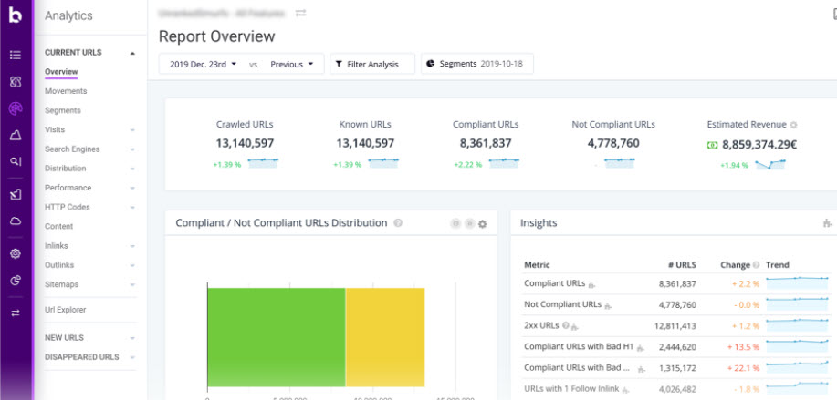 Botify was designed to give both macro views of a site's performance (all reports and charts) and micro thanks to the URL Explorer. The "URL Explorer" menu is a very complete and efficient URL segmentation tool. We can cross hundreds of segmentation criteria (AND / OR), and the results always appear almost instantaneously, even on a site of several tens of thousands of URLs.