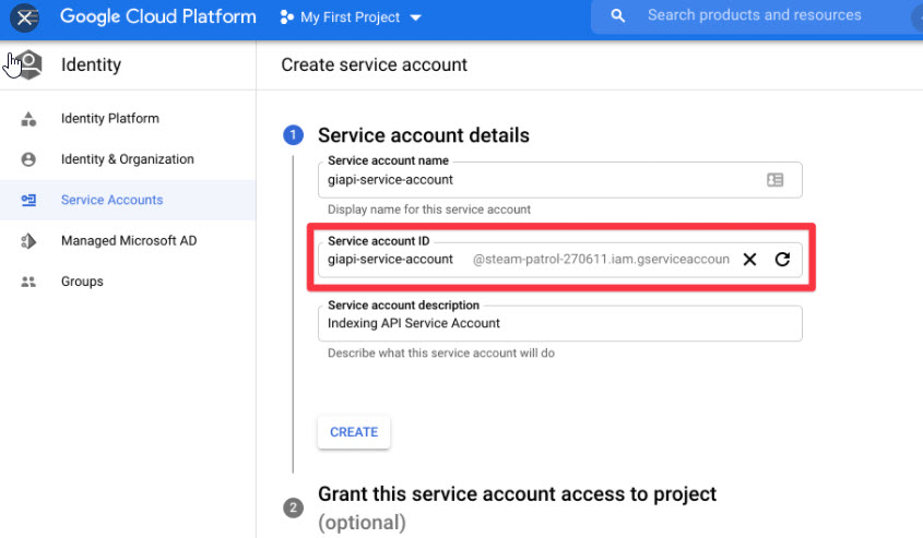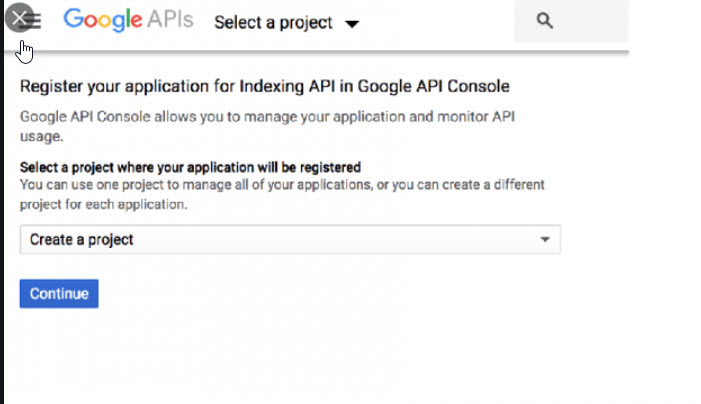 Such a project can be created quickly - follow this link: console.developers.google.com/flows/enableapi?apiid=indexing.googleapis.com&credential=client_key and select the " Create project. "
