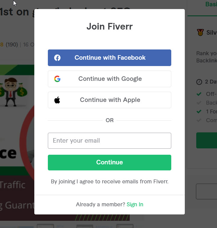 You can sign up for Fiverr by email, Facebook, or Google account. For example, I use email always (Because you have to register via Facebook, you have to open an email to activate). Enter your email and click Continue