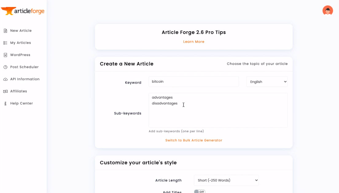 Unlike most "robot editors," Article Forge will provide you with quality content while offering the amount 100% automated and speedy. On Article Forge, to create a new article, you need to put one or more keywords, choose your language (French, English, German, Italian, Portuguese, or Spanish), and select the length of the desired text (50, 250, 500, or 750 words) and that's it.