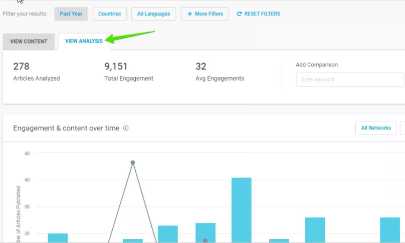 Next to the content view tab you will see the Analysis tab. In this feature, Buzzsumo will produce very detailed statistical results of data about the main keyword in the content store available on the internet.