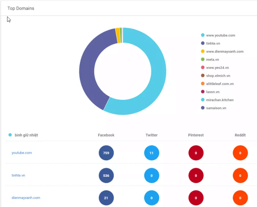 In this section, Buzzsumo will give you an accurate chart of the engagement of content around the keyword "thermos" with the best number of interactions coming from any source through the website's domain name.