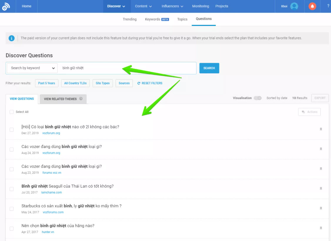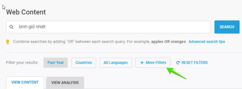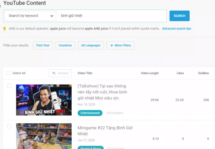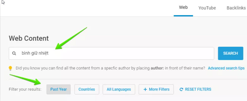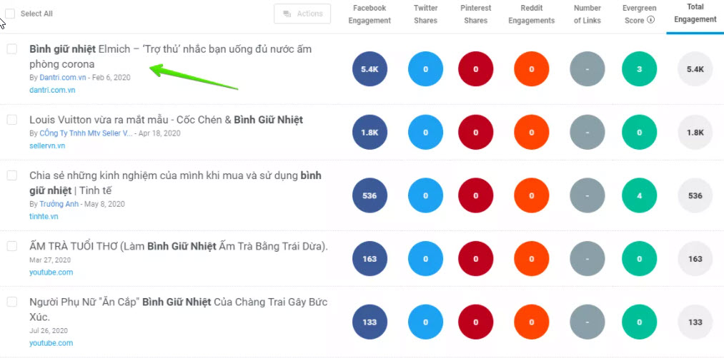 I will continue to take the example of the "thermos bottle" key, I will use the filter below, here I want to filter to see the results over the past 1 year, which content has the most interest in the word. What is the main key and which websites come from, is the engagement high.