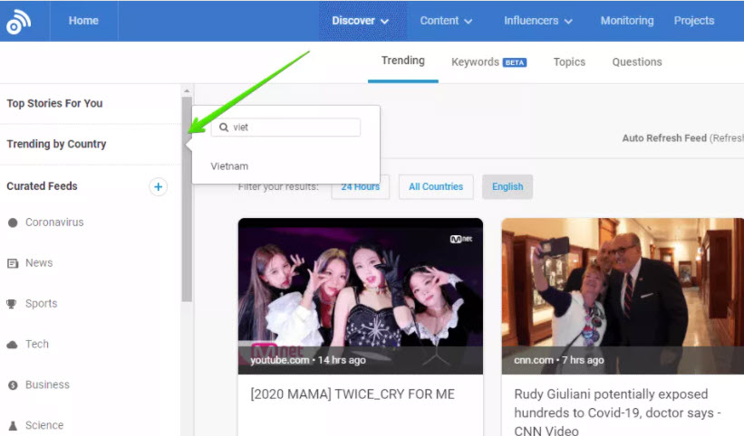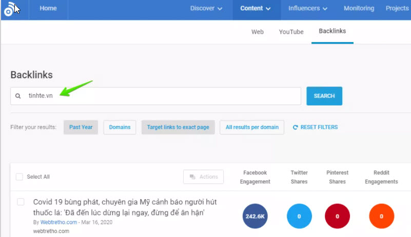 With web content, you just need to enter a main keyword or topic of the website you want to perform, and buzzsumo will give you an endless repository of content for you to analyze, review and select to create content. own.