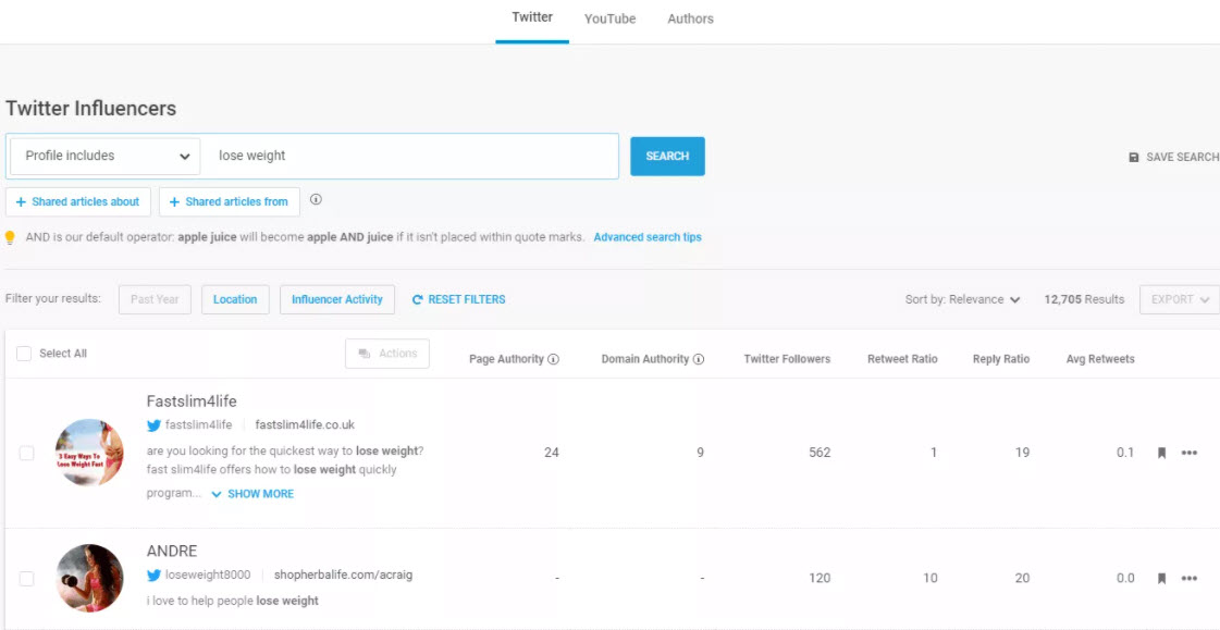 The Influencers tab is a feature that can help you find the exact influencers in the niche you're working on through three main channels: Twitter, Youtube, Authors (for companies or large businesses).