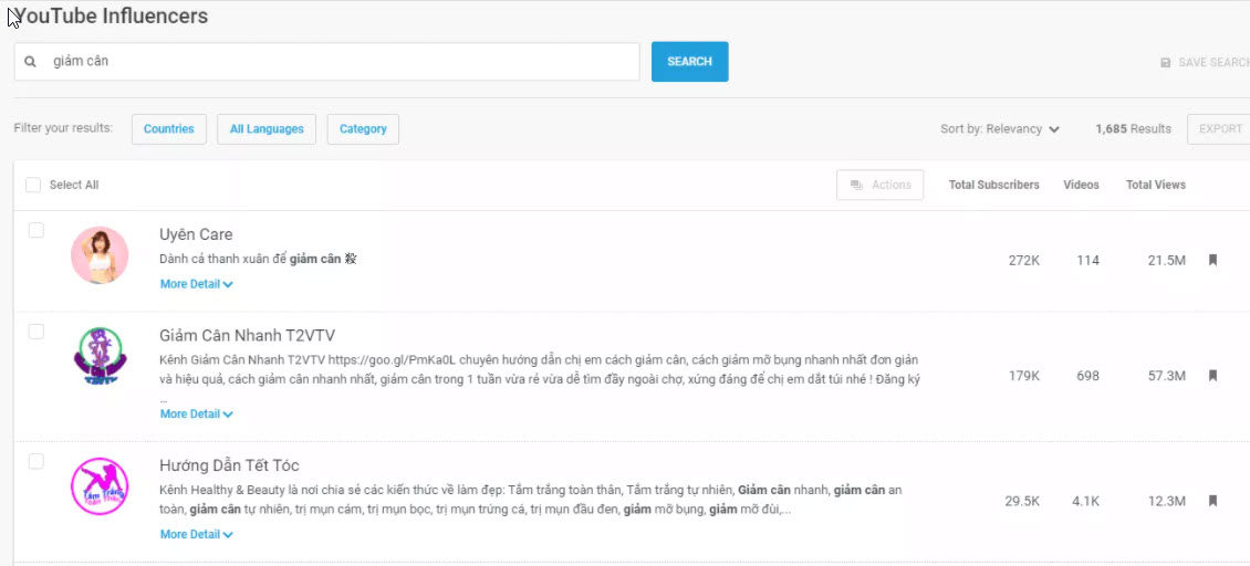 With the keyword "weight loss" that I take the example above, the number of influential people on Youtube is much higher than Twitter, which is only in the Vietnamese market.