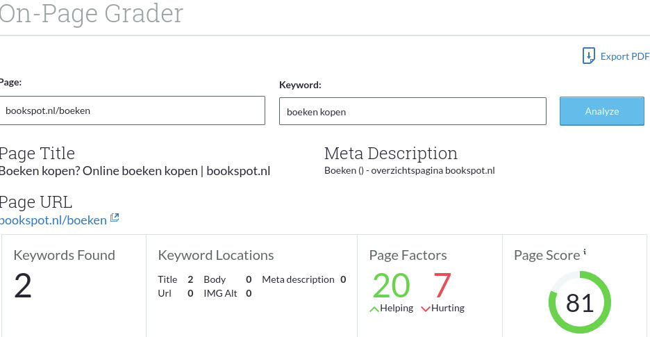 The On-page Grader indicates which factors your competitors are currently not fulfilling well on the page. This way, you spot trends where competitors are still making mistakes. According to you, you fulfill these factors as well as possible to be sure that the website is better optimized than the competitor's page. And you do that quickly and easily for every page on your website related to the most interesting keywords. This takes away all guesswork; you do not have to guess what you still need to optimize against the competitor but immediately receive an action list with points to fulfill as quickly as possible.