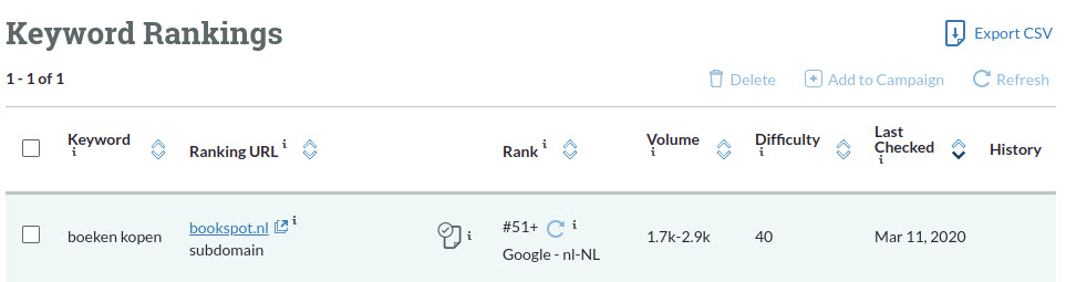 To keep track of the results of your SEO campaigns, you need an overview of your positions in Google. You can keep track of this at Moz via the Rank Checker. You enter a keyword where you want to score high. Then every day in Google, it is checked which position your page is on. Here you can read what consequences your new backlinks have had and what optimizing pages will yield. This is essential as an SEO professional as it is the best way to understand which parts of your SEO campaigns are paying off.