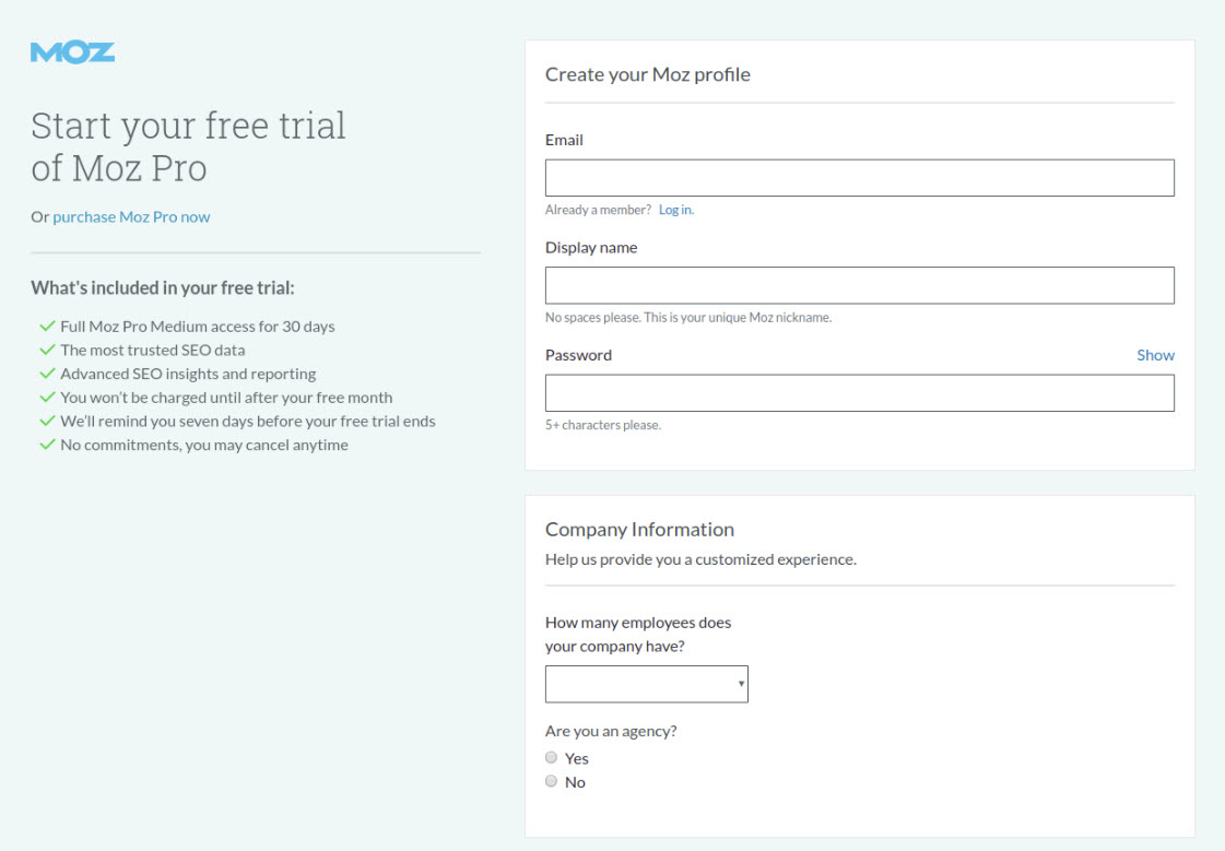 First, go to Moz's website to create a new account. You do this directly via https://moz.com.